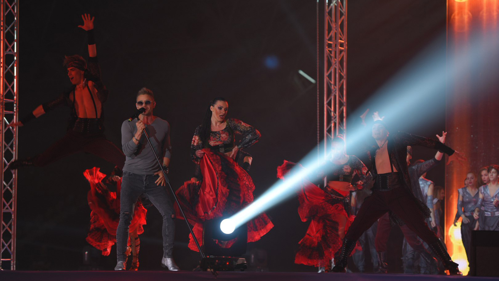 Слова сменяются музыкой. На экране большие геометрические фигуры в стиле конструктивизма. Это не случайно – вспомните афиши ко дню города-2016. На их фоне артисты исполняют акробатические номера. Тот самый момент, когда слова излишни –зрители прекрасно понимают язык тела: целеустремленность, стойкость, дерзость и молодость – это все про Новосибирск.