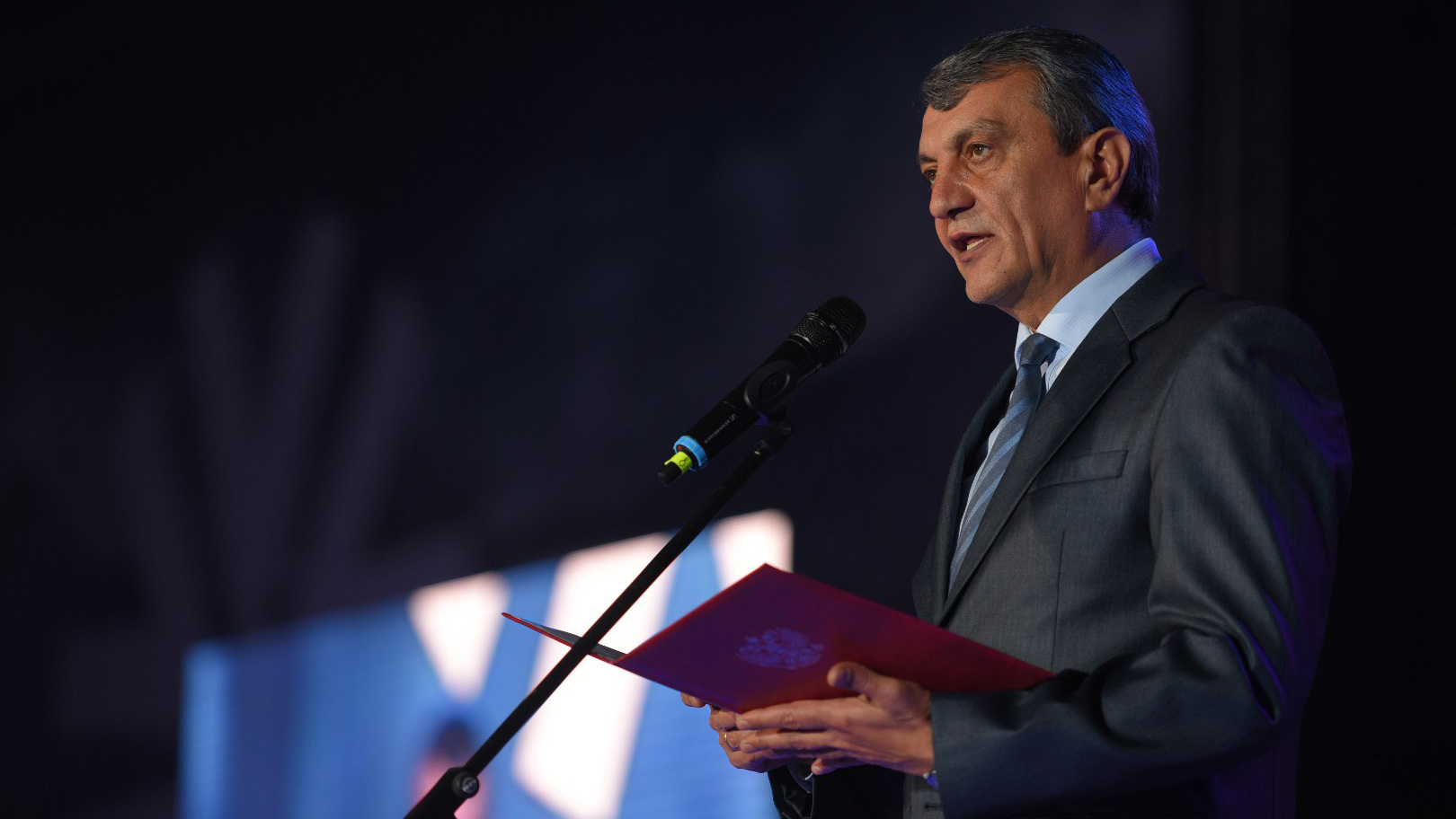 На сцене полномочный представитель Президента РФ в Сибирском федеральном округе Сергей Иванович Меняйло. Зачитывает приветственное послание Президента России Владимира Владимировича Путина к участникам Всероссийского слета студенческих отрядов. Зал взрывается бурными аплодисментами. Полпред объявляет Всероссийский слет студенческих отрядов открытым!